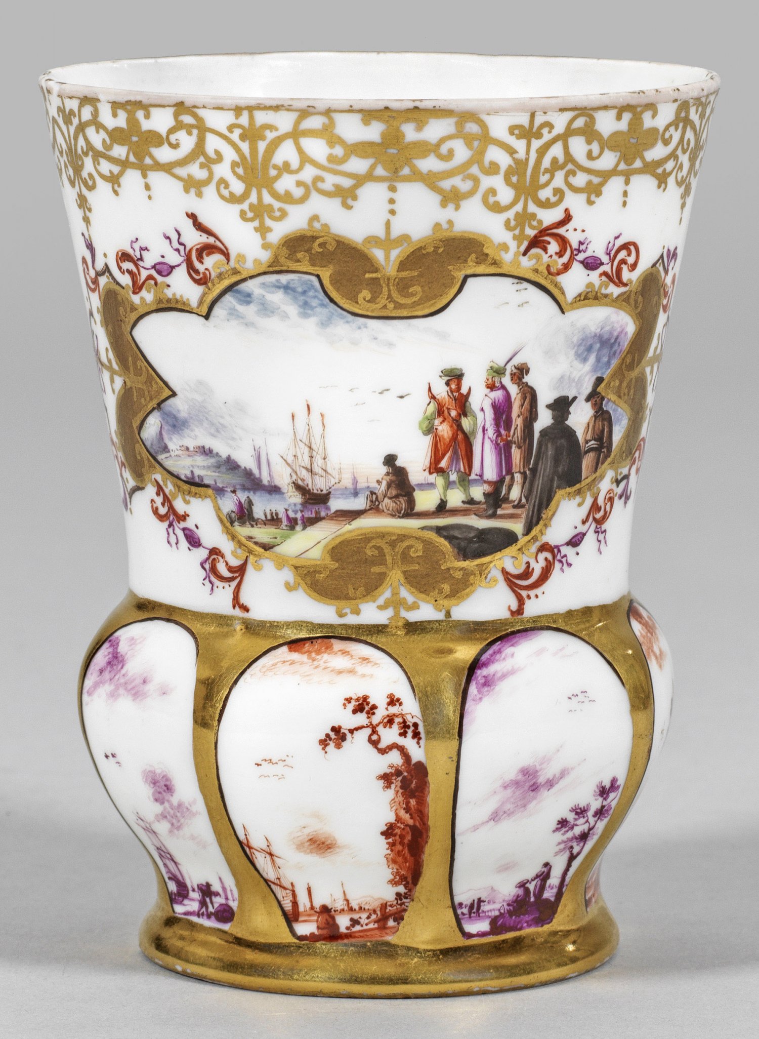 Seltener Becher mit Kauffahrteiszenen Auf rundem Stand gebauchter, achtfach abgeplatteter Ansatz, in konisch ansteigende Wandung übergehend. Beidseitig der Wandung vierpassige, von Ranken in Purpur und Eisenrot umzogene Bandelwerkkartuschen in Gold, darin unterschiedliche Uferlandschaften mit figurenreichen Kauffahrteiszenen in polychromer Malerei. Unterhalb auf Goldfond, acht ausgesparte Ovalreserven mit korrespondierenden, szenischen Darstellungen, abwechselnd in purpurfarbener und eisenroter Camaieumalerei. Umlaufend breite Goldspitzenbordüre. Gold-Nr. 4. H. 11,5 cm.