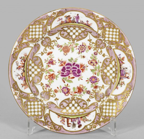 Runde Form mit glattem Goldrand. Im leicht vertieften Spiegel farbiger Indianischer Blumendekor aus großer Päonie im Zentrum, umgeben von kleinen Chysanthemen- und Prunusblüten. Auf der Fahne passig ausgesparte Reserven mit Hoeroldt-Chinoiserien, szenische Darstellung von festlich gekleideten Chinesen bei der Teezeremonie in blühender Gartenlandschaft. Umlaufend reiche Goldornamentik aus stilisiertem Rankenwerk mit Lüsterfond sowie drei- und viereckigen, mit Gitterwerk gefüllten Feldern. Die Tellerunterseite mit langgestreckten, asiatischen Blütenzweigen. Polychrome Malerei in Eisenrot, Purpur, Gelb und teilw. Braun. Reste eines alten Klebeetiketts. Gold-Nr. 18. Ber.; Schwertermarke. D. 21,5 cm.