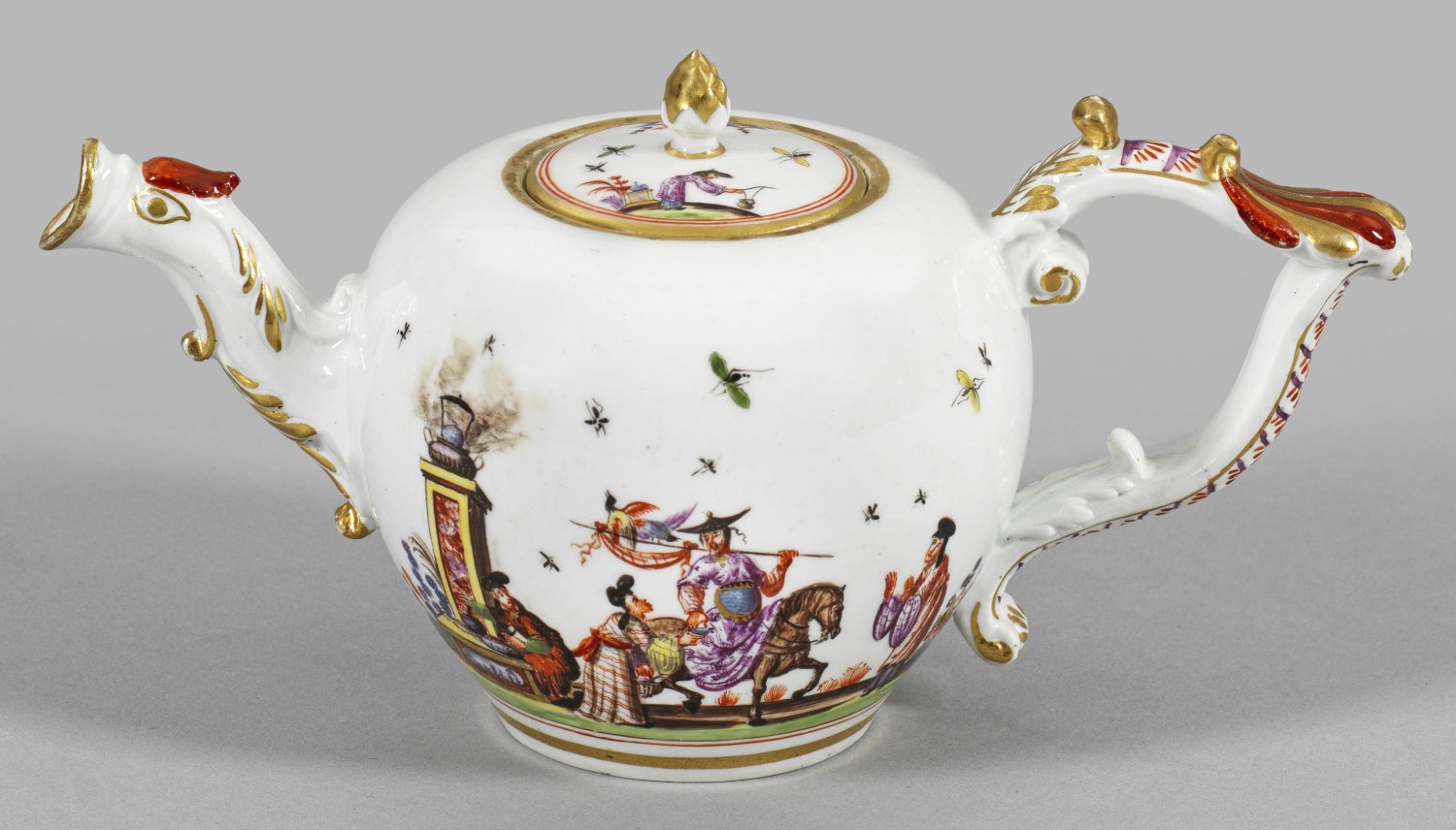 Kleine Teekanne mit Hoeroldt-Chinoiserien Kugeliger Korpus, seitlich volutierter J-Henkel mit geripptem, in Purpur und Eisenrot staffiertem Schuppendekor und Palmettenrelief, gegenüber geschweifter Tierkopfausguss. Leicht gewölbter Deckel mit plastischem Pinienknauf. Beidseitig der Wandung feiner Chinoiserie-Dekor. Auf der Schauseite zu Pferd sitzender, von zwei Dienern flankierter, chinesischer Herrscher mit geschultertem Stab, auf dem zwei exotische Vögel sitzen. Seitlich ein weiterer Diener, am Ofen Tee zubereitend. Auf der Rückseite szenische Darstellung einer Familie in asiatischer Gartenlandschaft, umgeben von Personal bei der Teezubereitung. Korrespondierende Einzeldarstellungen auf dem Deckel. Feine polychrome Malerei aus der Werkstatt von Johann Gregorius Hoeroldt. Reiche Goldstaffage. Schwertermarke. H. 9,5 cm.