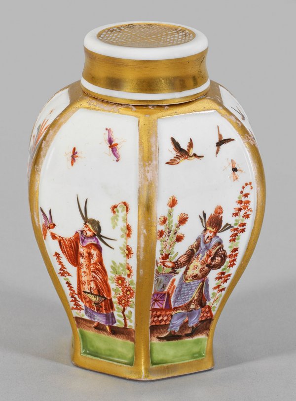 Teedose mit Hoeroldt-Chinoiserien Balusterförmiger Korpus mit sechsfach profilgerahmter Wandung, kurzem Hals und flachem Deckel mit gitterartigem Golddekor. In goldgerahmten Reserven unterschiedliche szenische Darstellungen eines Chinesen in blühender, asiatischer Gartenlandschaft bei der Teezeremonie, beim Pflücken und Transportieren von Steinfrüchten bzw. beim Wandeln durch den Garten, sog. Chinoiserien. Polychrome Malerei in Purpur, Eisenrot, Blau, Moosgrün, Braun, Schwarz und Gelb von Philipp Ernst Schindler d. Ä. (1694 - 1765); Goldstaffage. Unw. ber./rest.
