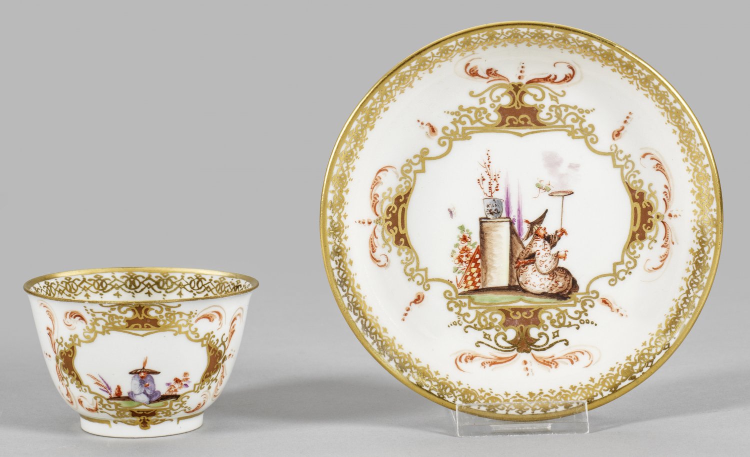 Koppchen mit Hoeroldt-Chinoiserien auf Unterschale. Böttgerporzellan. Leicht gebauchter sich konisch erweiternder Korpus mit ausschwingendem Rand. Beidseitig der Wandung und im Spiegel vierpassige von eisenroten Ranken umzogene Bandelwerkkartuschen darin Einzeldarstellungen von sitzenden Chinesen in Gartenlandschaft in polychromer Malerei. Umlaufende Goldspitzenbordüren. Gold-Nr. 26. Schalenunterseite mit drei eisenroten Ringlinien. H. 4 5 cm.