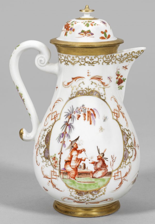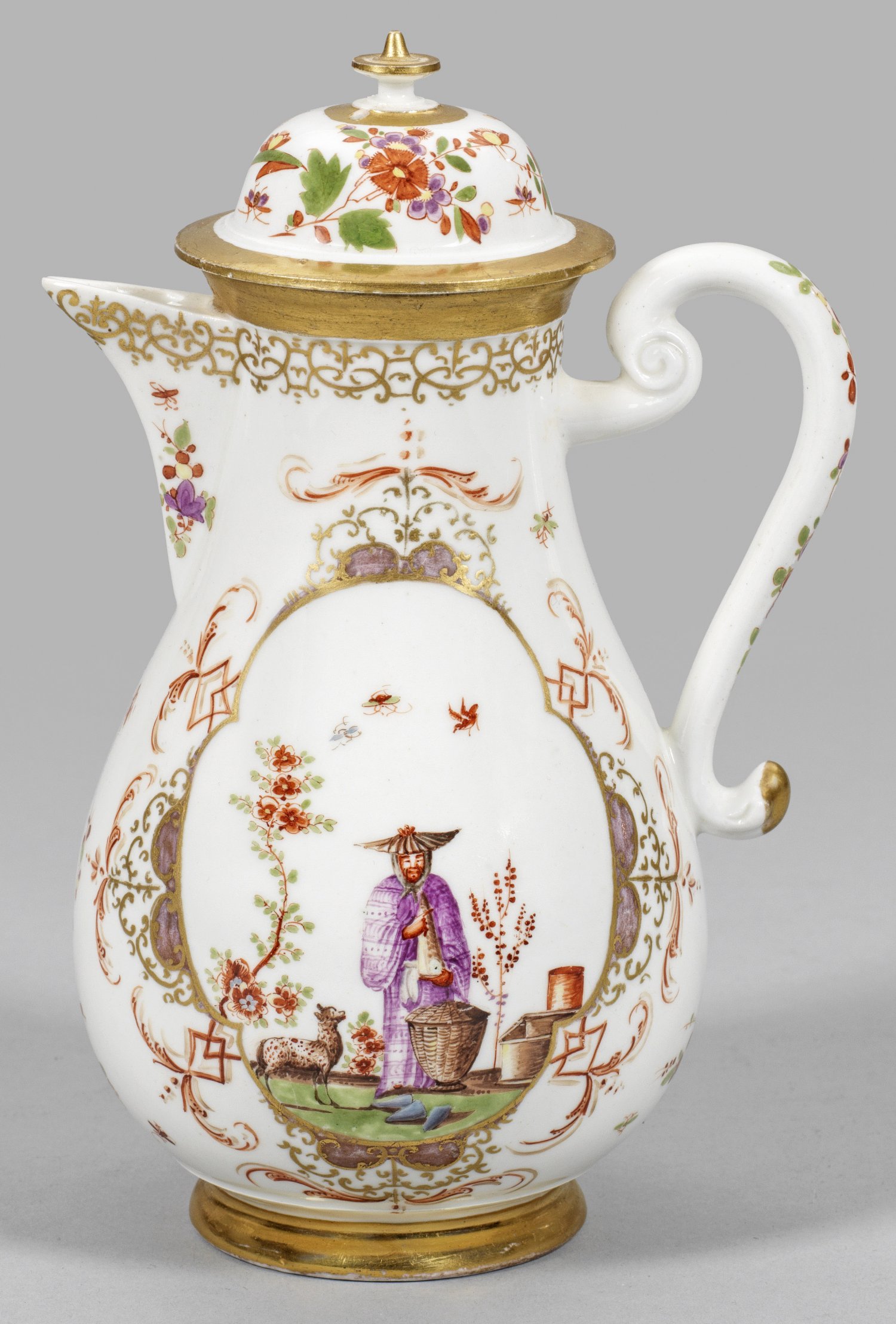 Kaffeekanne mit Hoeroldt-Chinoiserien Böttgerporzellan. Birnförmiger Korpus mit Volutenhenkel und spitzem Schnabelausguss. Überkragender, aufgewölbter Deckel mit Scheibenknauf. Beidseitig der Wandung, von eisenroten Ranken umzogene, vierpassige Bandelwerkkartusche mit sog. Chinoiserien. Szenische Darstellungen von festlich gekleideten Chinesen in blühender asiatischer Gartenlandschaft beim Verrichten verschiedener Tätigkeiten. Auf Deckel, Ausguss und Henkelrücken feiner Dekor aus Indianischen Bumen mit Insekten. Feine polychrome Malerei in Seegrün, mit reicher Goldstaffage. Umlaufende Goldspitzenbordüre. Gold-Nr. 22. Unw. rest.; H. 20,5 cm.