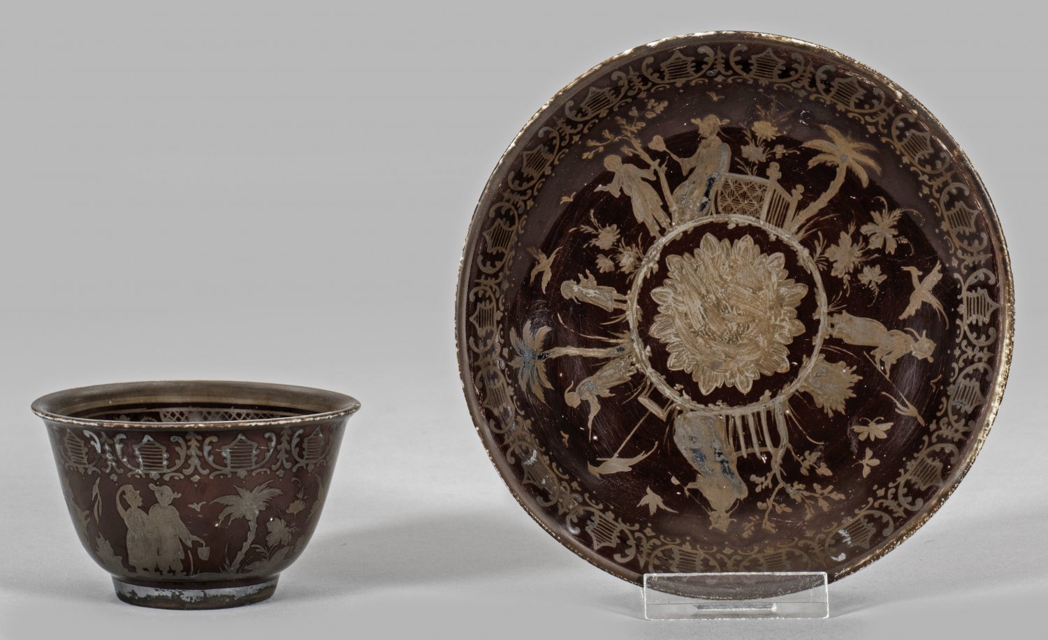 Hausmaler-Koppchen mit Chinoiseriedekor Leicht gebauchter, sich konisch erweiternder Korpus mit ausschwingendem Rand. Schokoladenbrauner Fond. Auf der Wandung und im Spiegel sog. Chinoiserien, szenische Darstellungen von Chinesen in stilisierten Gartenlandschaften, umzogen von feinen Bandelwerk- und gitterartigen Spitzenbordüren. Im Spiegel des Koppchens Motiv eines Vogels, auf einem Ast sitzend. Radierte Silbermalerei. Im Boden ligiertes Monogramm JH mit drei Punkten und Dat. (17)37 in Doppelringlinie für Josef Hackl (1710-1785), zeitweise Hausmaler in der Augsburger Seuter-Werkstatt. Minim. retuschiert, Best.; H. 4,5 cm.