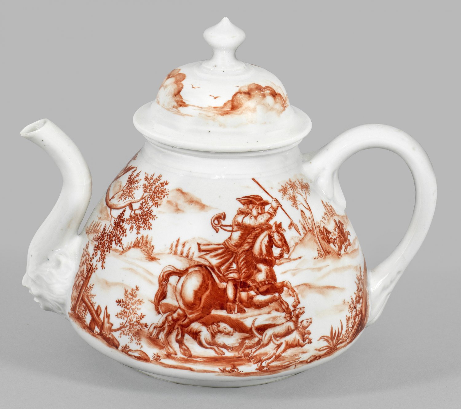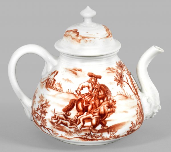 Seltene frühe Teekanne mit Hausmalerei von Ignaz Preissler Gebauchter, sich nach oben verjüngender Korpus. Seitlich gerundeter Henkel mit stilisierten Blattansätzen sowie gebogter, aus einem Maskaronkopf aufsteigender Röhrenausguss. Haubenförmiger Deckel, mittig hochgezogener Scheibenknauf. Umlaufend der Wandung jagdliche Szenen in baumbestandener, hügeliger Landschaft. Auf der Schauseite Jäger zu Pferd mit Speer, begleitet von einer Hundeschar, auf der Rückseite dargestellte Bärenjagd mit Reiter und Hunden, einen Bären anfallend. Eisenrote Camaieumalerei von Ignaz Preissler oder Werkstatt. Nach Kupferstichvorlagen von Georg Philipp Rugendas (1666 - 1742). K.P.M.-Marke. H. 13 cm.