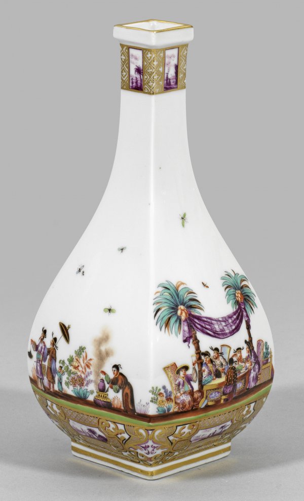 Sakeflasche mit Chinoiserien Über quadratischem Stand vierkantiger in langen schmalen Hals übergehender Korpus. Auf vier Wandungsseiten feiner Chinoiserie-Dekor auf breiten Ornamentkonsolen aus Bandel- und Gitterwerk sowie ausgesparten Reserven mit purpurfarbenen Genreszenen. Umlaufend szenische Darstellungen von Chinesen in blühender Gartenlandschaft bei der Teezeremonie bzw. im Spiel mit Kindern auf breiten Ornamentkonsolen aus Bandel- und Gitterwerk sowie purpurfarbenen Genreszenen. Unterhalb des profilierten Randes breite Mosaikbordüre mit korrespondierenden Purpurszenen. Äußerst feine polychrome in Gold gehöhte Kakiemonmalerei in Eisenrot Kupfergrün Gelb und Schwarz. Golddekor. H. 21 cm.