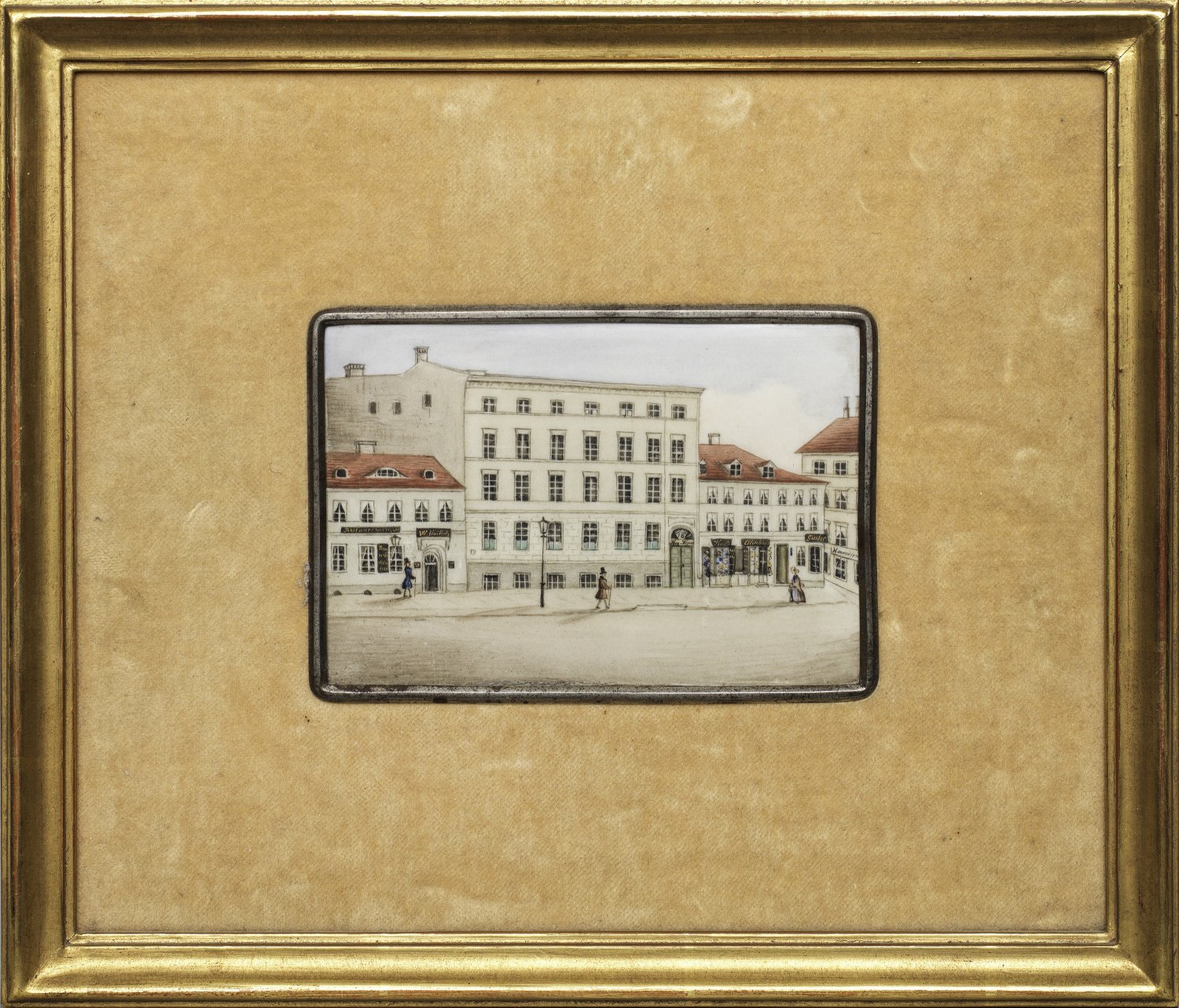 Biedermeier-Porzellanbild mit Berliner Straßenansicht Rechteckige Bildplatte. Städtische Ansicht der Mohrenstraße in Berlin mit Blick auf die Stickmusterverlagshandlung "Hertz & Wegener", Haus-Nr. 18 sowie Figurenstaffage. Polychrome Malerei. Rücks. bez. Profilierter, stuckierter, vergoldeter Rahmen mit Metallleiste und gelbbeiger Samtblende. Platte 9,5 cm x 13,5 cm. Rahmen 25,5 cm x 29,5 cm.