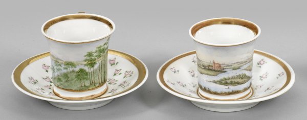 Paar Biedermeier-Tassen mit Landschaftsdekor auf Untertassen. Schauseitige, baumbestandene und teilw. architekturbestandene Landschaft, umgeben von Rosenblütendekor in polychromer Hausmalerei. Goldstaffage. Im Boden dat. "1858". Zepter- und Pfennigmarke. H. 7 cm.