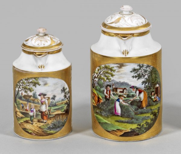 Kaffee- und Heißwasserkanne mit Genreszenen Zylindrischer Korpus mit gekantetem Henkel und gewölbtem Deckel. Schauseitig, in Goldfond, ausgespartes Medaillon mit szenischen Darstellungen von Bauern bei der Ernte in feiner polychromer Malerei. Stilisierter, teilw. radierter Golddekor. Gold teilw. ber.; H. 14,5 cm - 17,5 cm.