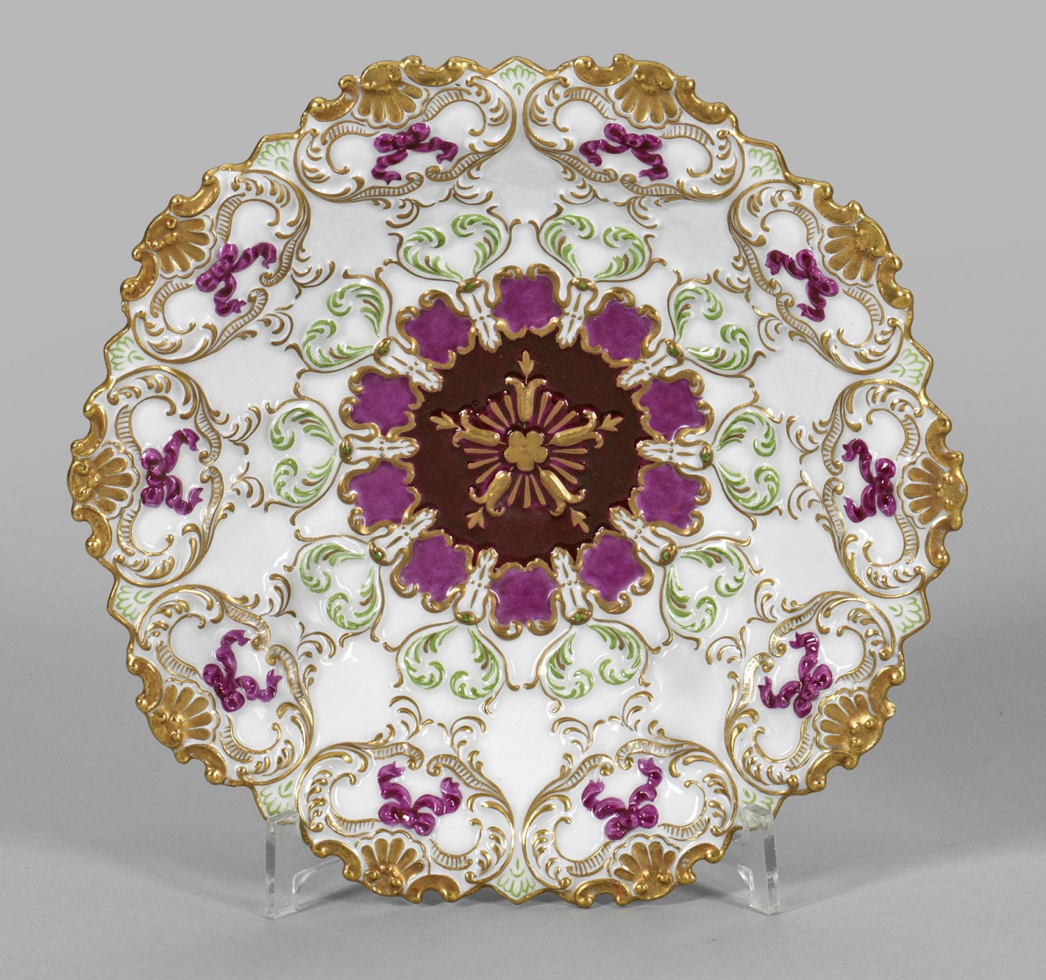 Prächtige Historismus-Zierschale mit Reliefdekor Runde gemuldete Form. Flächendeckend üppiger Reliefdekor aus Rocaille- und Blattwerk stilisierten Blüten und Schleifen. Farbige Bemalung in Purpur und Grün mit reicher Goldstaffage. H. 5 5 cm. D. 26 cm.