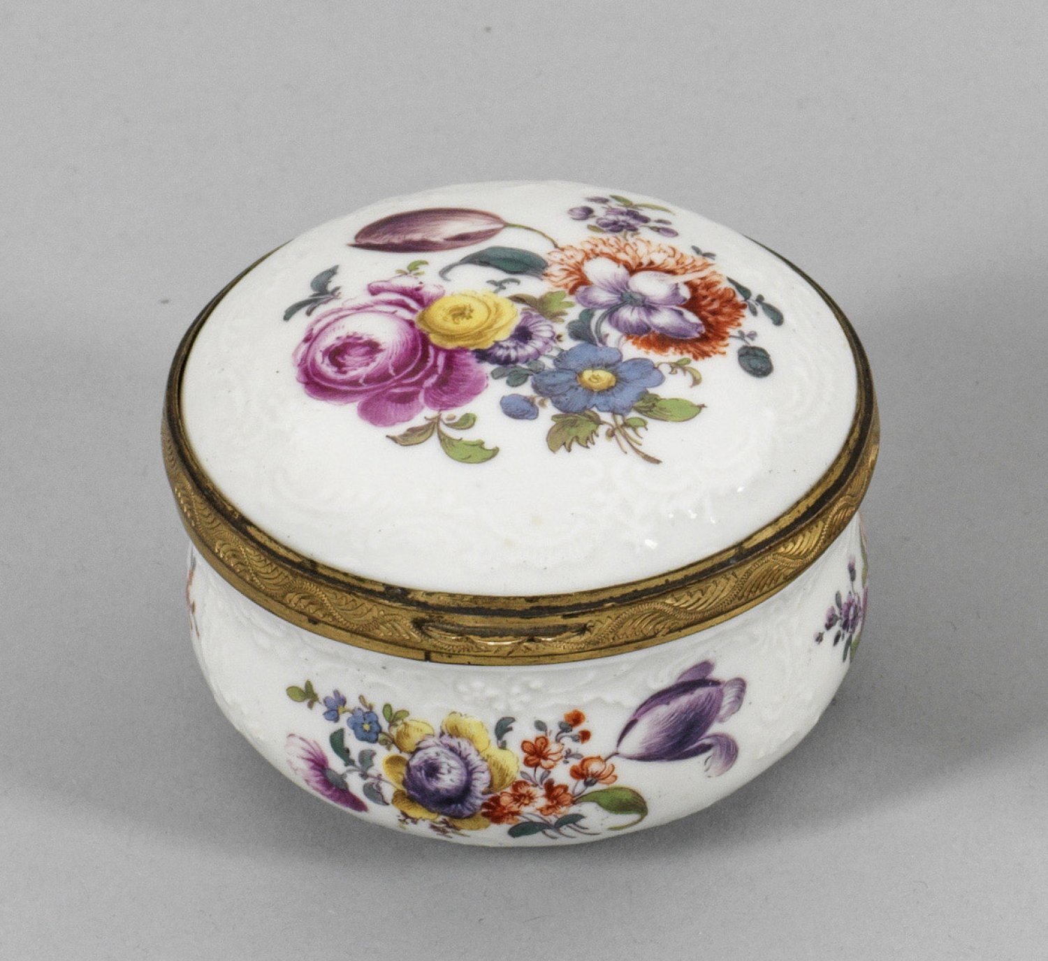 A German porcelain box with flowers and brass mounting.
