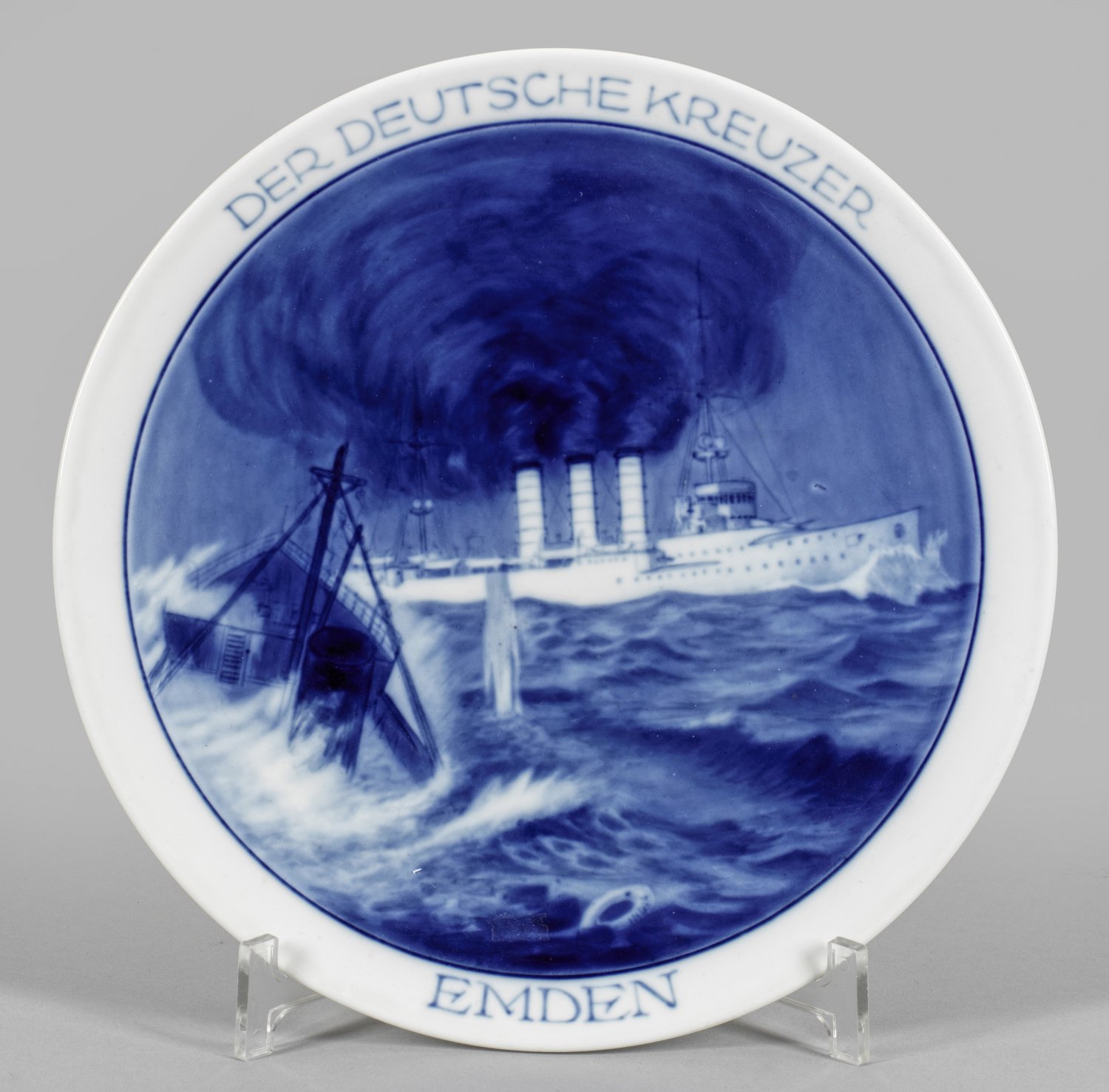 Patriotischer Wandteller "Der Deutsche Kreuzer Emden" Erinnerungsteller aus dem 1. Weltkrieg. Im flachen Spiegel unterglasurblaue Darstellung eines Seegefechts mit der "SMS Emden". Schwertermarke. D. 25,5 cm.