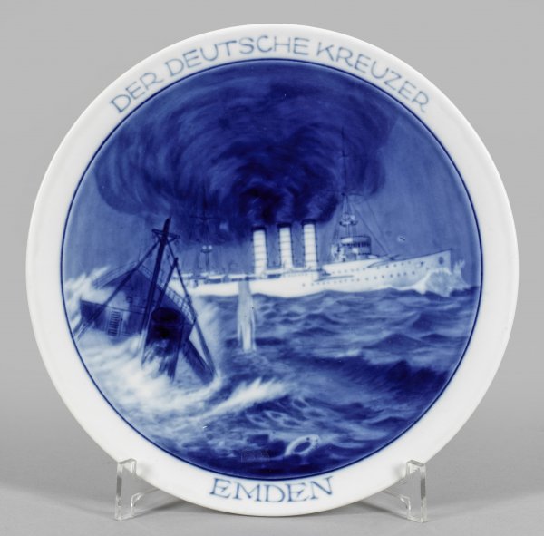 A patriotic porcelain plate from WW I with cruiser "SMS Emden". Crossed swords mark.