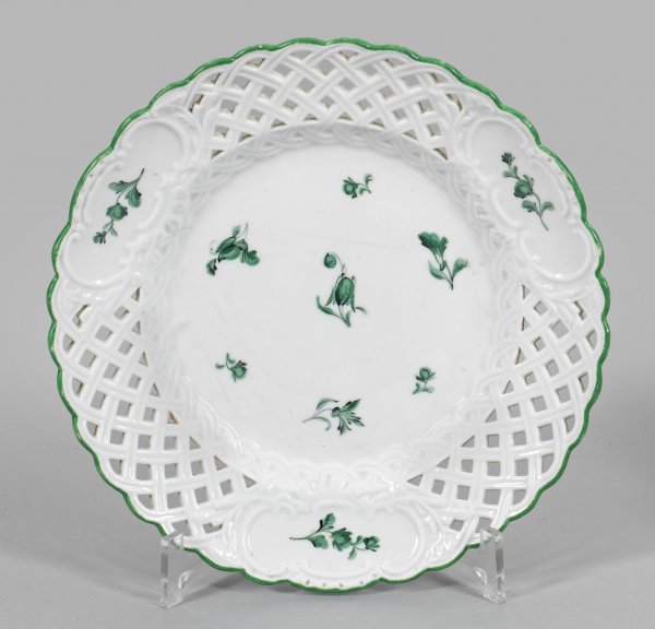 Zierteller mit Streublumendekor Runde leicht vertiefte Form. Durchbrochen gearbeitete Fahne mit Reliefkartuschen. Streublumenmalerei. Schwertermarke.
