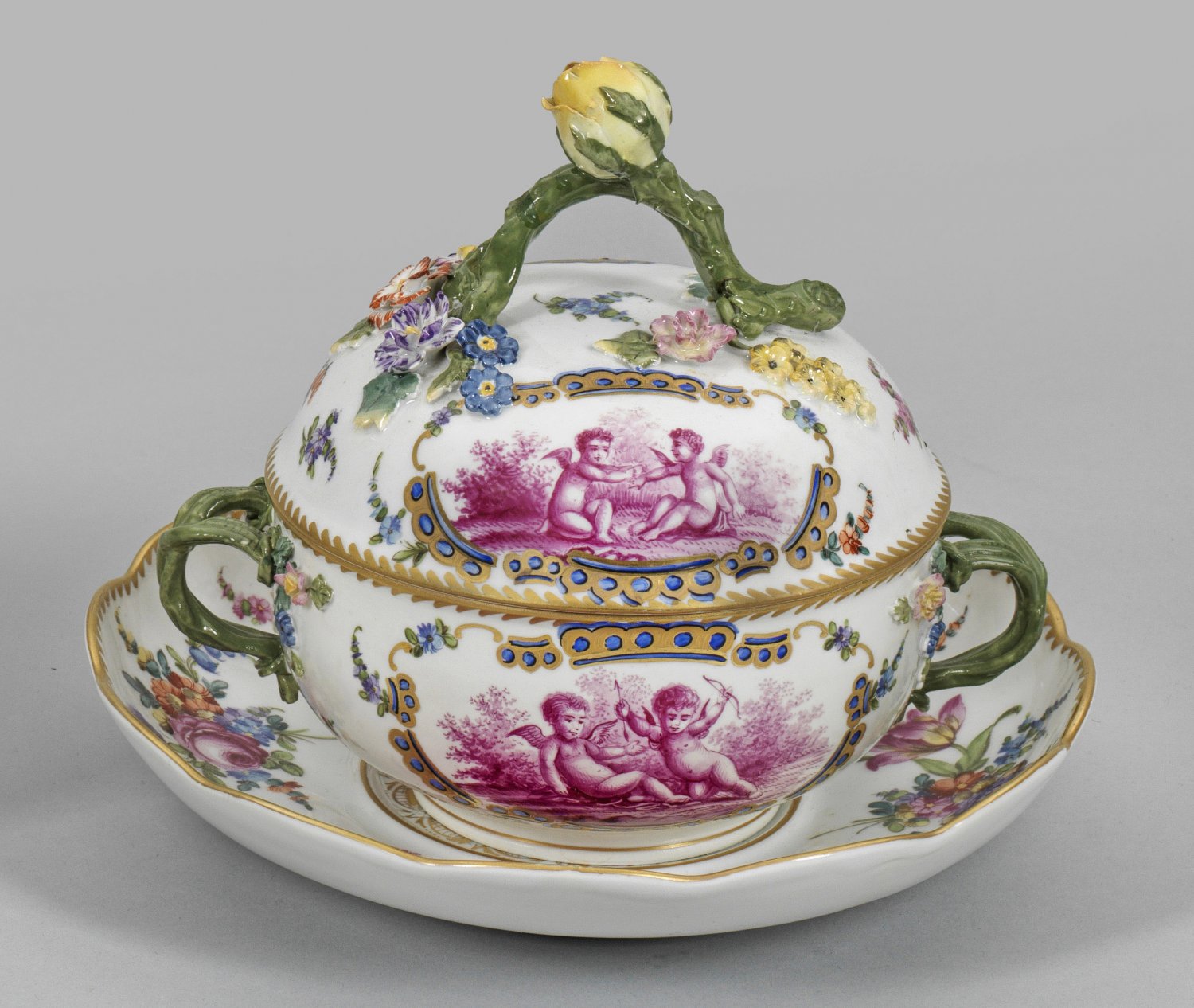 Kleine Deckelterrine auf Présentoir mit gewundenen Asthenkeln und Knauf als hochgewundener Rosenzweig. Malerei in Purpurcamaieu. Aufgelegte plastische Blüten. Goldborte an den Kanten. Manufakturmarke. D. 22 cm.