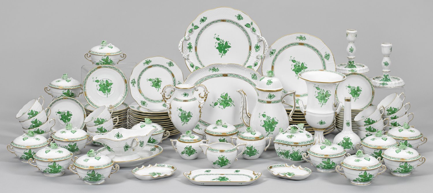 Kaffee- und Speiseservice "Apponyi grün" von HEREND für 12 bzw. 14 Personen. 71-tlg.; Kaffeekanne, 2 Zuckerdosen, Sahnegießer, 14 Kaffee-, 14 Suppentassen mit Untertassen,