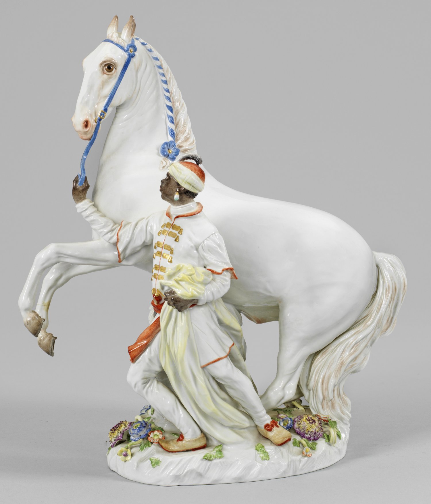 Große Figurengruppe "Mohr mit Schimmel" Ovaler, mit plastischen Blüten und Blättern belegter Felssockel. Neben einem sich aufbäumenden Schimmel stehender Mohr in weißem Gewand mit radierten Goldapplikationen und Turban. In der rechten Hand die Zügel, in der Linken ein zartgelb staffiertes Tuch haltend. Polychrome Malerei mit Goldakzentuierung. Entw. Johann Joachim Kaendler. Besch./Rep.; Schwertermarke. H. 42 cm.