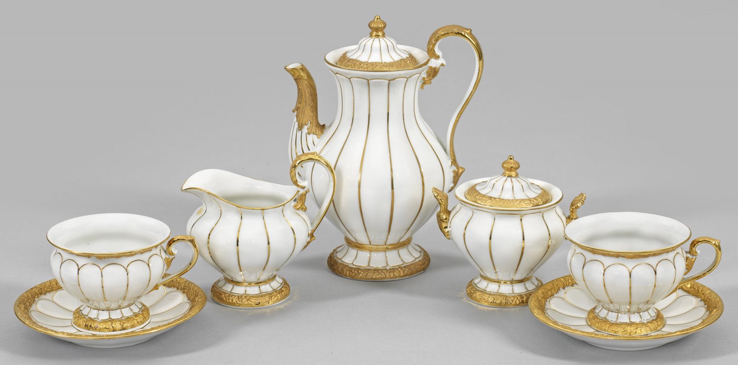 Prunk-Mokkaservice mit reichem Golddekor 5-tlg.; Mokkakanne, Sahnegießer, Zuckerdose, 2 Tassen mit Untertassen. Feiner reliefierter Weinblattdekor in Glanzgold und Goldbronze. Schwertermarke. Kannen-H. 21,5 cm.