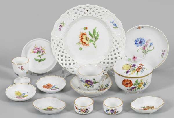 Konvolut mit Dekor "Deutsche Blume" 12-tlg.; Gebäckteller, Zuckerdose, Mokkatasse mit Untertasse, Eierbecher, 6 Salzgefäße, 2 Untersetzer. Teilw. durchbrochen gearbeitet mit Rocaillekartuschen. Farbige Blumen- und teilw. Früchtemalerei. Teilw. Goldrand. Teilw. best./rep.; Schwertermarke. Zuckerdose H. 10 cm. Schälchen D. 8-13,5 cm.