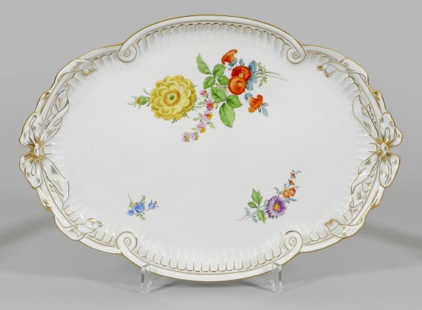 Tablett mit Dekor "Deutsche Blume" Ovale, flach gemuldete Form mit passig geschweiftem Rand und schleifenförmig reliefierten Griffen. Gerippte Innenwandung. Im Spiegel großes, farbenfrohes Blumenbukett, umgeben von gestreuten Gebinden in polychromer Malerei. Reiche Goldstaffage. Schwertermarke. 40 cm x 28 cm.