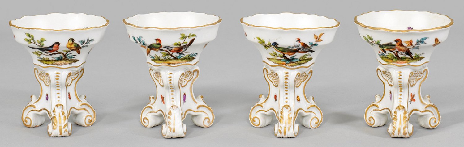 Vier Gewürzschalen Von drei Blattvoluten getragener, dreiseitiger Sockel mit sich konisch erweiternder, gemuldeter Schale. Auf der Wandung Vogeldekor mit Insekten und Schmetterlingen in polychromer Malerei. Reiche Goldstaffage. Minim. ber.; Teilw. Manufakturmarke. H. 9,5 cm.