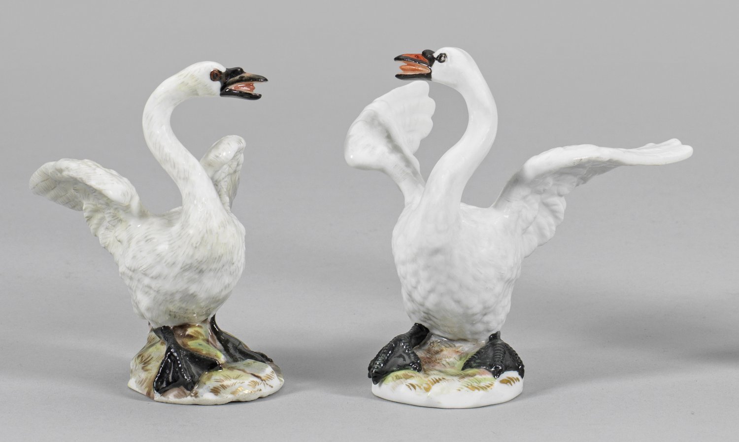 Paar Schwanenfiguren Auf naturalistisch staffiertem Terrain stehender Schwan mit ausgebreiteten Flügeln. Reliefiertes, fein gezeichnetes Gefieder. Sparsame polychrome Malerei, teilw. mit Gold. Modell-Nr. 2213 und 2214. Rest.; Schwertermarke. H. 10 cm.