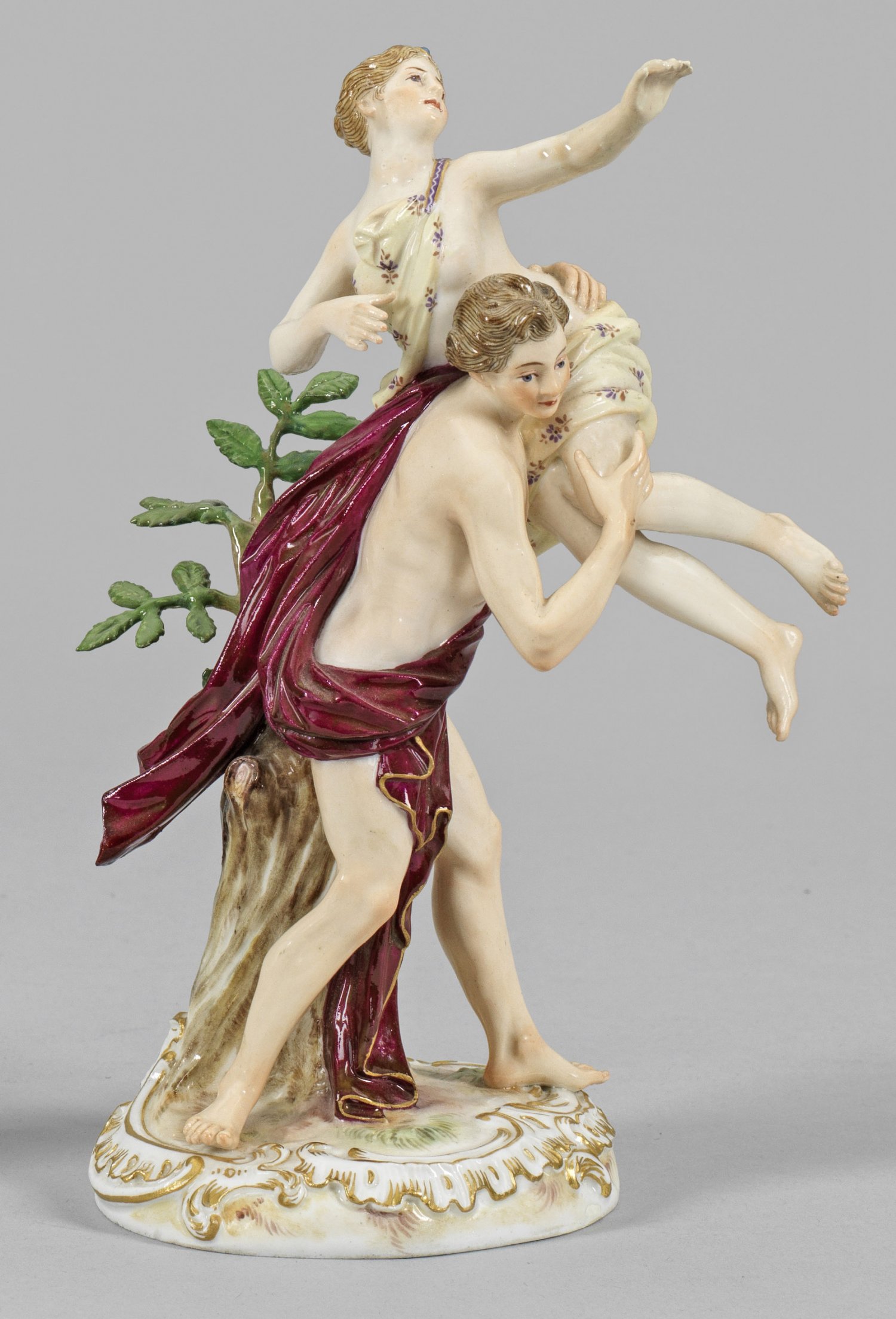 "Raub der Sabinerin". Originaltitel Auf rocaillereliefiertem Sockel stehender Boreas, auf seiner linken Schulter die geraubte Sabinerin Oreithyia davontragend. Polychrome Malerei mit Goldstaffage. Entw. Johann Joachim Kaendler. Modell-Nr. 1919. Rest.; Schwertermarke. H. 18 cm.