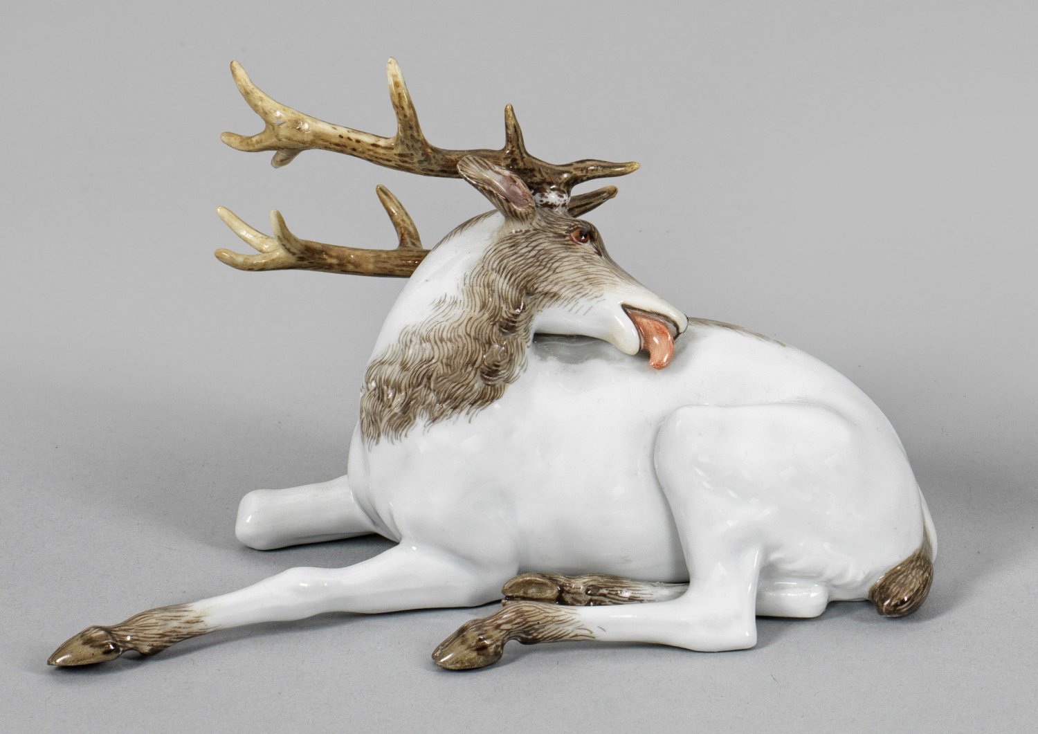 Hirsch Vollplastisch gearbeitete Figur eines liegenden, sich putzenden Hirsches, den linken Vorderlauf von sich gestreckt. Naturalistische Fellzeichnung in hell- bis dunkelbraunen Tönen. Entw. Carl Gotthelf Habenicht. Modell-Nr. W 41. Unw. rest.; Schwertermarke. H. 9 cm.