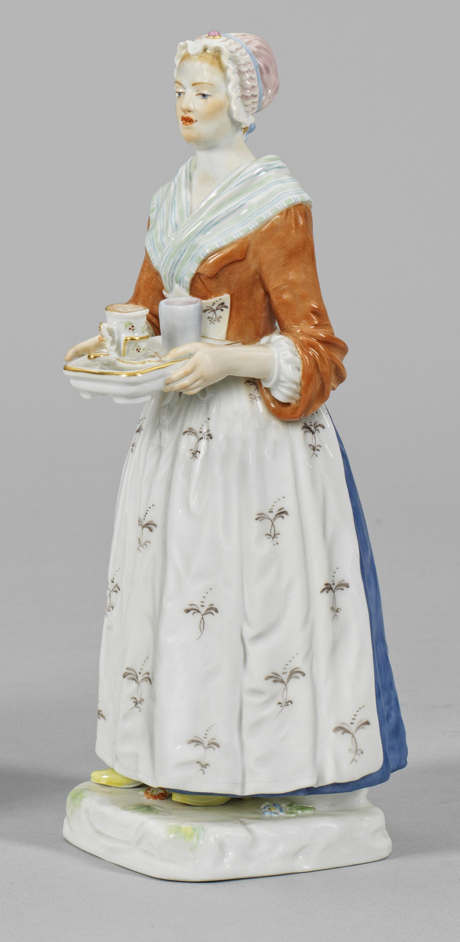 "Das Schokoladenmädchen". Originaltitel nach dem berühmten Pastell von Jean-Étienne Liotards (1744). Auf quadratischem Sockel stehende Dienstmagd in bürgerlicher Kleidung des Rokoko, das Haar von einer spitzengesäumten Haube bedeckt. In den Händen ein Tablett mit einem Glas Wasser sowie einer Trembleuse mit Kakao haltend. Polychrome, zarttonige Malerei mit dezenter Goldkonturierung. Modell-Nr. 73431. Schwertermarke. H. 18,5 cm.