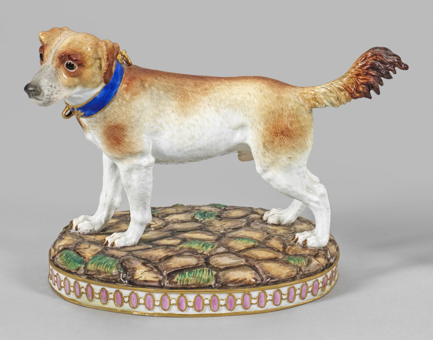 Jagdhund Ovaler Sockel mit reliefierter Ornamentbordüre. Auf naturalistischem Terrain stehender Jagdhund mit leicht nach links gewandtem Kopf, ein blaues Halsband tragend. Naturalistische Ausführung mit feiner Fellzeichnung. Polychrome Malerei mit Gold. Entw. Chr. G. Lück. Modell-Nr. H 33. Minim. rest.; Schwertermarke. H. 20 cm.