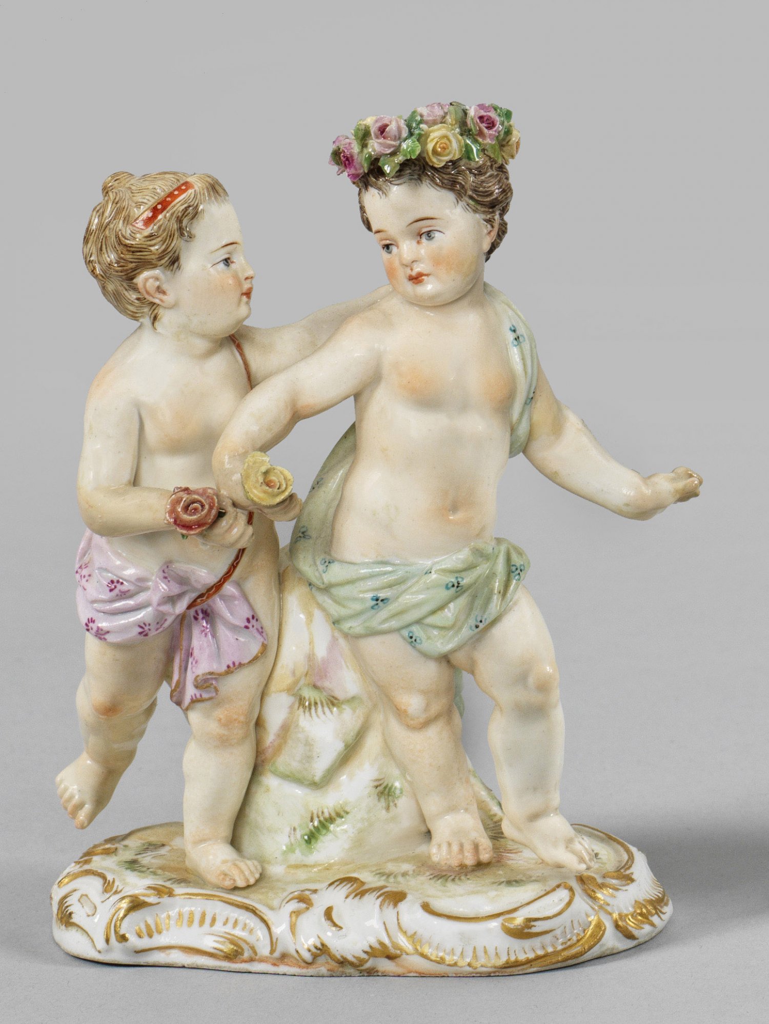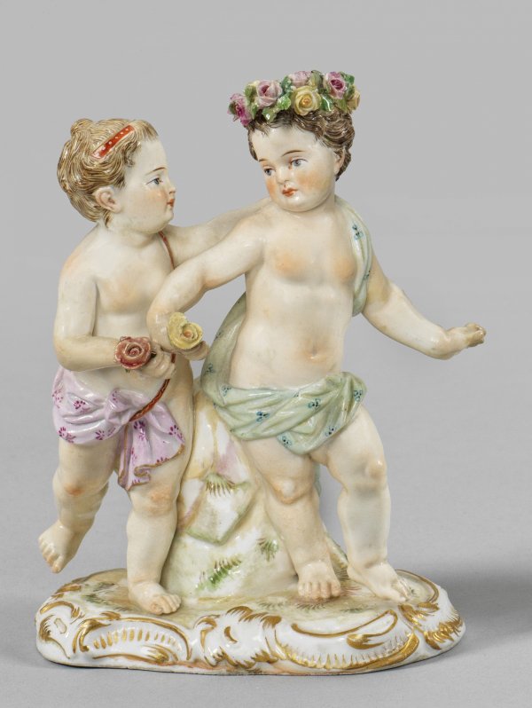 Genienpaar Auf rocaillereliefiertem Sockel stehendes Mädchen, sich einem Knaben mit Blumenkranz und -strauß zuwendend. Polychrome Malerei mit Goldstaffage. Entw. Carl Christoph Punct. Modell-Nr. 2990. Rest.; Schwertermarke. H. 11,5 cm.