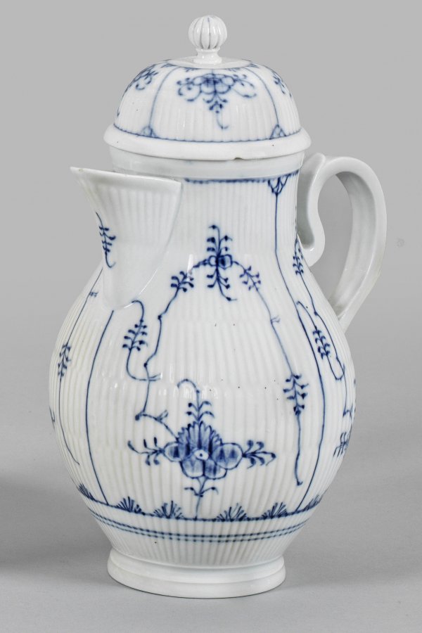 Große Kaffeekanne mit Strohblumenmuster Birnförmig mit aufgewölbtem Deckel und geschweiftem Bandhenkel. "Gebrochener Stab"-Relief. Strohblumenmuster in unterglasurblauer Malerei. Minim. best.; Manufakturmarke. H. 26 cm.