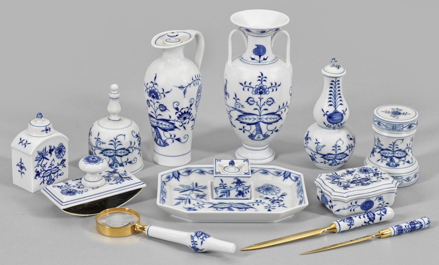 Porzellan-Ensemble mit Zwiebelmusterdekor 12-tlg.; Tintenzeug, 2 Vasen, Kännchen, Glocke, Löschwiege, 2 Brieföffner, Lupe, 2 Deckel- und eine Teedose. Zwiebelmusterdekor in unterglasurblauer Malerei. Teilw. minim. rep.; Schwertermarke. Vasen-H. 14 cm - 19 cm.