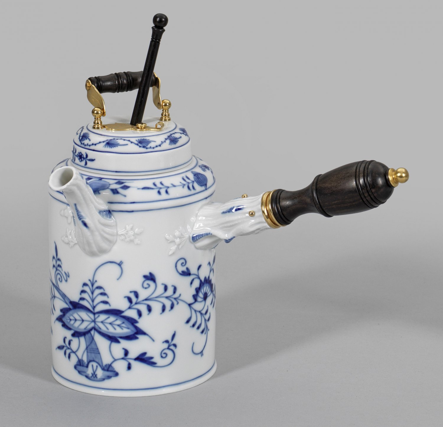 Schokoladenkanne mit Zwiebelmusterdekor Zylindrischer Korpus. seitlich balusterförmiger Griffansatz sowie astförmig reliefierter Röhrenausguss. Übergreifender Deckel mit runder Aussparung. Flächendeckender Zwiebelmusterdekor in unterglasurblauer Malerei. Vergoldete Montierungen und gedrechselter Holzgriff. Schwertermarke. H. 17 cm.