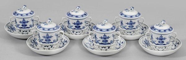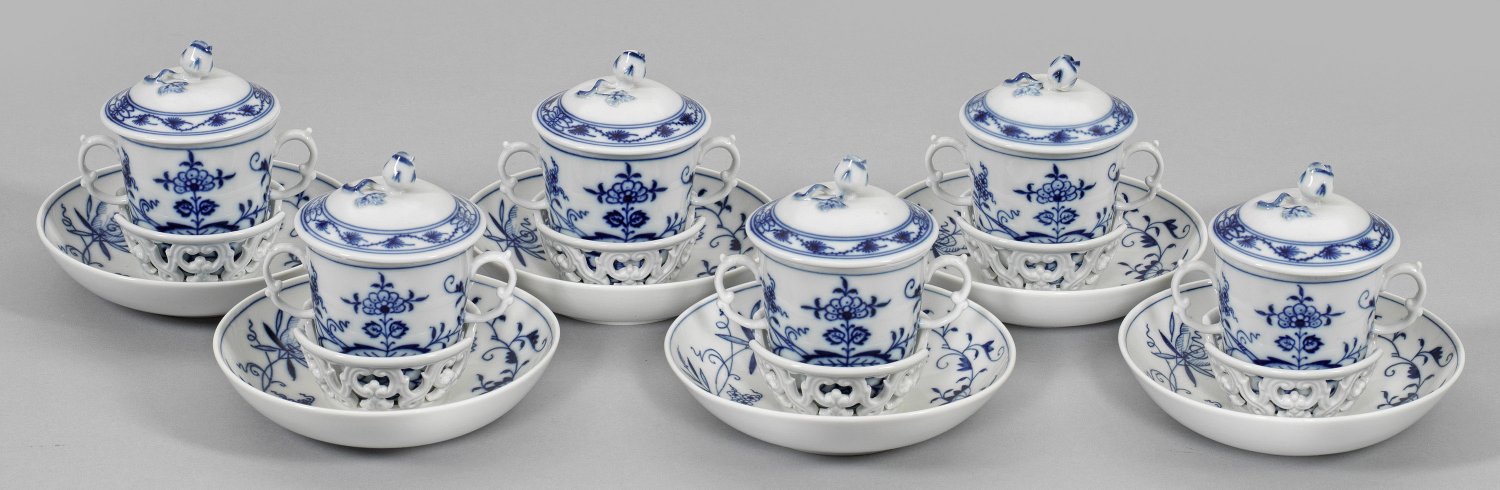 Sechs Trembleuses mit Zwiebelmusterdekor auf Untertasse. Hoher, sich konisch erweiternder Korpus mit Doppelhenkel. Gewölbter Deckel mit plastischem Blütenknauf. Umlaufender Zwiebelmusterdekor in unterglasurblauer Malerei. Minim. best.; Schwertermarke. H. 11 cm.
