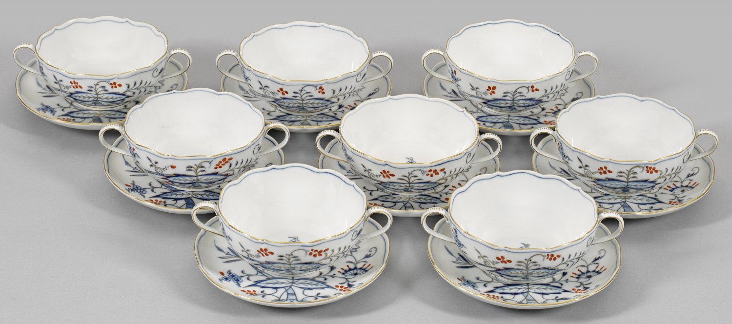 Acht Suppentassen mit Zwiebelmusterdekor auf Untertassen. Runde, halbkugelige Form mit Ohrenhenkeln. Zwiebelmusterdekor in unterglasurblauer Malerei, überdekoriert in Rot. Goldrand. Teilw. minim. best.; Schwertermarke. Tassen-D. 12,5 cm.