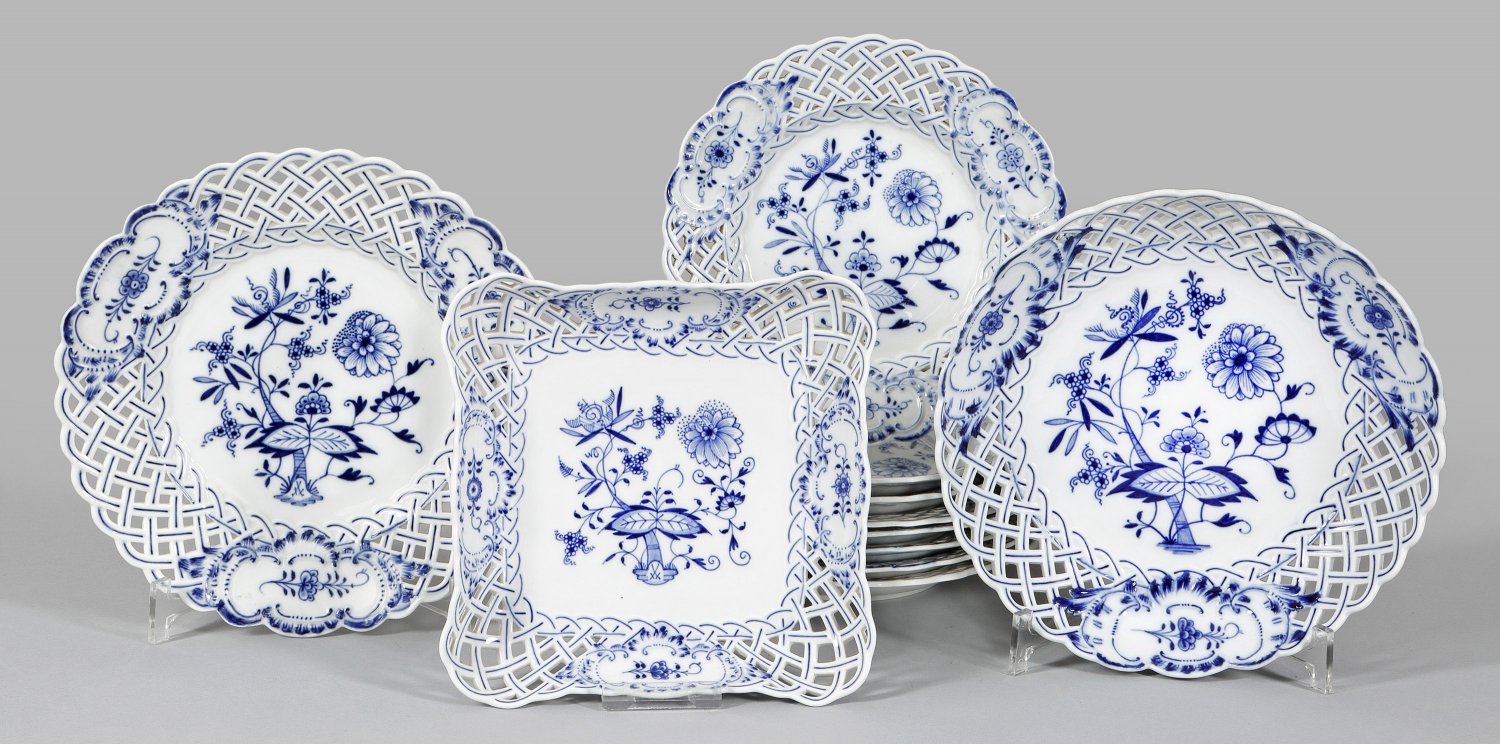 Neun Teller und zwei Schalen mit Zwiebelmusterdekor Runde bzw. eckige Form. Durchbrochen gearbeitete Fahne mit ausgesparten Rocaillereserven. Zwiebelmusterdekor in unterglasurblauer Malerei. Teller-D. 21 - 23,5 cm.
