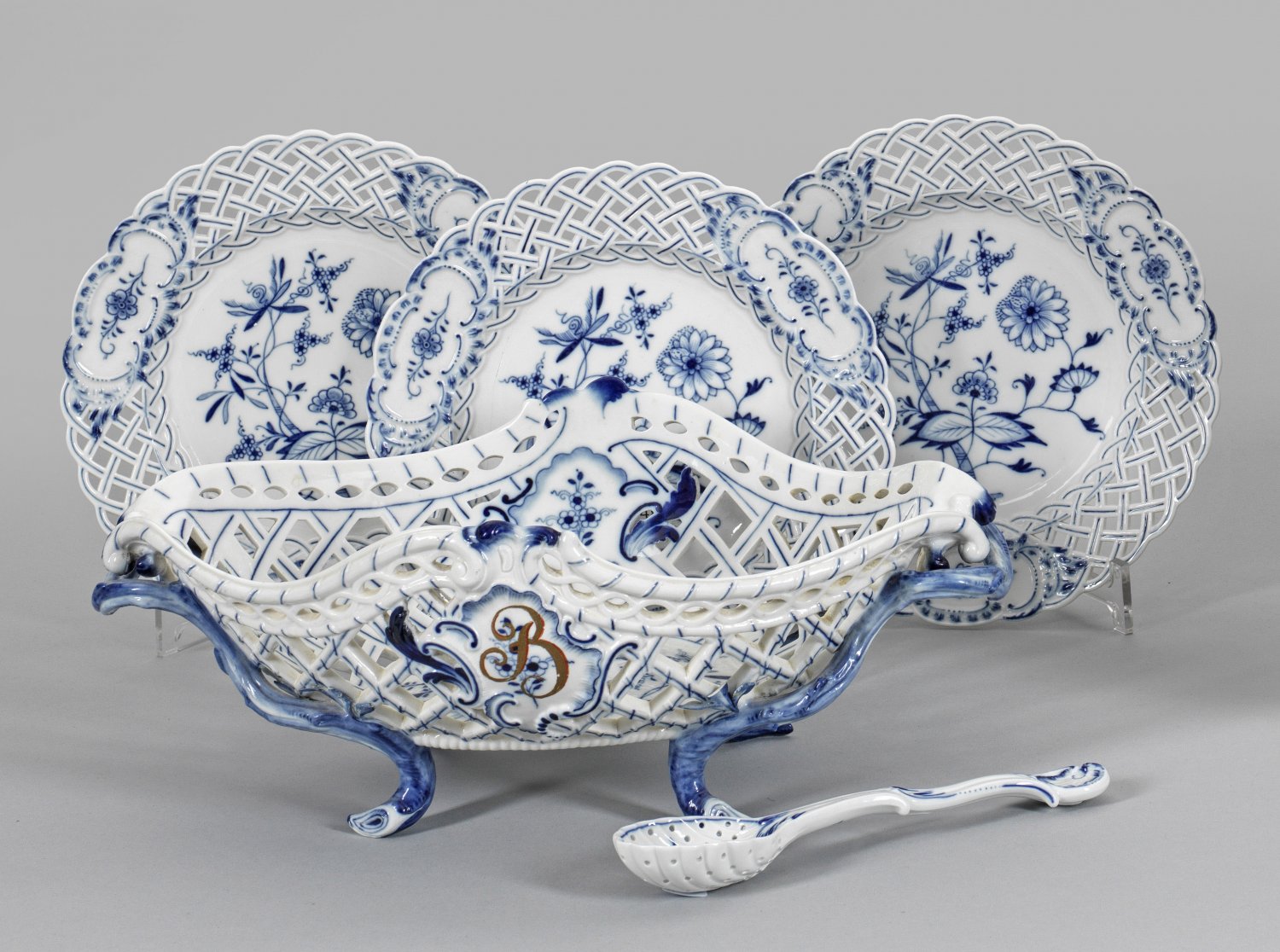 Porzellan-Ensemble mit Zwiebelmusterdekor 4-tlg.; Fruchtkorb, Zuckerstreulöffel und 2 Teller. Durchbrochen gearbeitet. Zwiebelmusterdekor in unterglasurblauer Malerei. Fruchtkorb mit Buchstabe "B" in Gold, rotschattiert. Schwertermarke. Fruchtkorb 37 cm x 22 cm. Teller-D. 23 cm.
