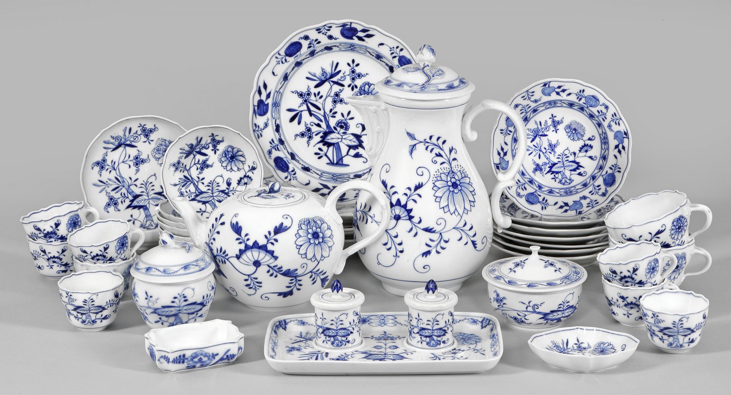 Restservice mit Zwiebelmusterdekor sowie dreiteiligem Schreibzeug. 31-tlg.; Kaffee-, Teekanne, 2 Zuckerdosen, 2 Kaffee-, 8 Mokkatassen mit Untertassen, 5 Kuchen-, 7 Konfektteller, 2 Schälchen. Zwiebelmusterdekor in unterglasurblauer Malerei. Teilw. best./ber.; Haarrisse. Schwertermarke. Kannen-H. 23 cm. Teller-D. 15 cm - 20,5 cm.