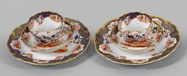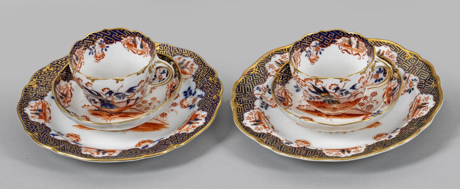 Paar Gedecke mit Imari-Dekor 4-tlg.; 2 Kaffeetassen mit Untertasse, 2 Kuchenteller. Stilisierter Dekor aus asiatischer Gartenlandschaft mit blühendem Prunusbaum, figürlichen Darstellungen sowie umlaufender Brokatbordüre auf kobaltblauem Fond. Unterglasurblaue Malerei, überdekoriert in Eisenrot und Gold. Teilw. minim. best.; Schwertermarke. Tassen-H. 6 cm. Kuchenteller-D. 25 cm.