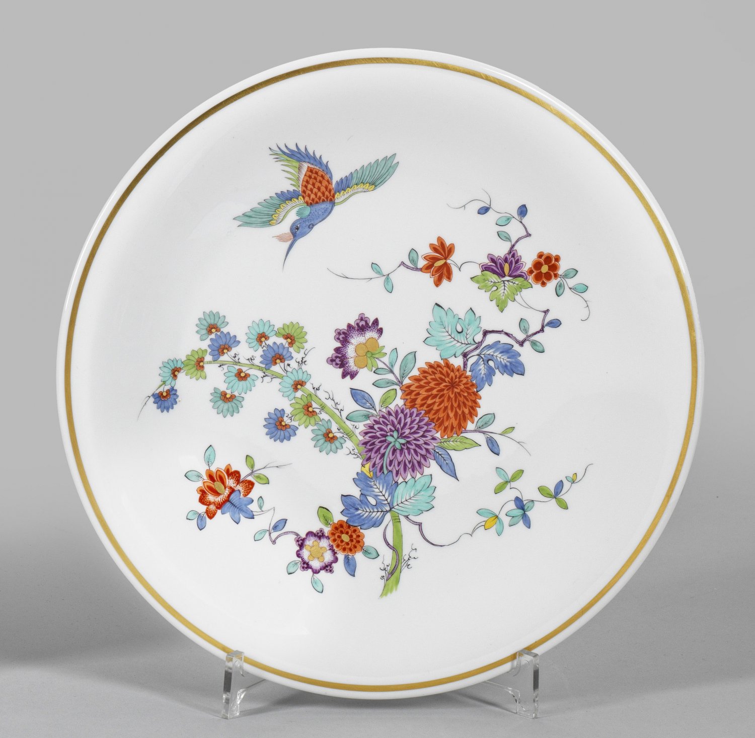 Großer Wandteller mit Indianischem Blumen- und Vogeldekor Runde leicht vertiefte Form. Farbenprächtiger Indianischer Blumendekor aus Chrysanthemen- und Päonienzweigen sowie fliegendem Vogel im Kakiemonstil. Polychrome goldgehöhte Malerei. Goldrand. Schwertermarke. D. 31 cm.