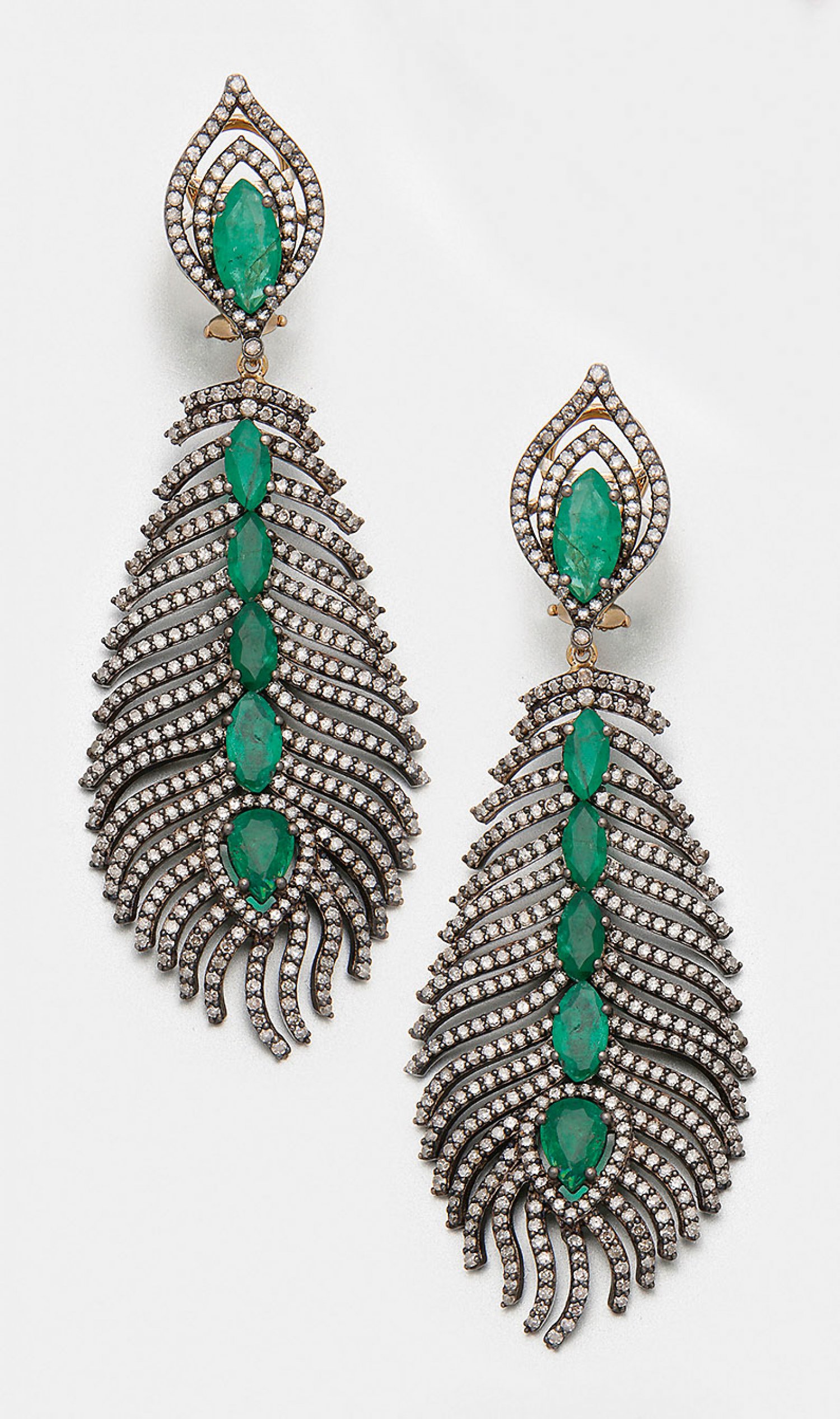 A pair of Russian earrings set with emeralds approx. 6,30 ct. and diamonds approx. 4,18 ct., in 14 k gold and silver.