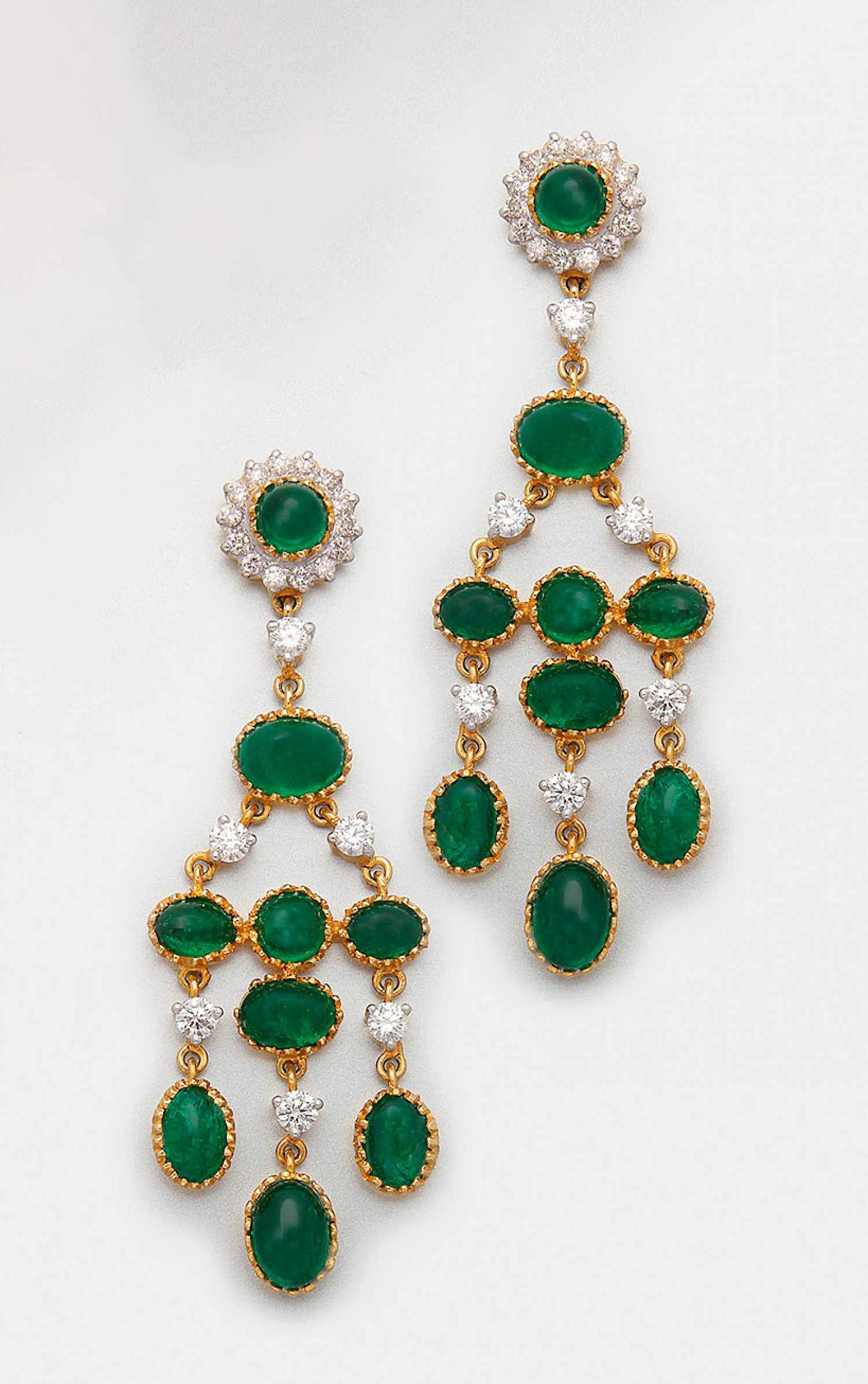 Paar repräsentative Smaragd-Chandeliers Gelbgold, gest. 750. Schauseitig besetzt mit leuchtendgrünen Smaragdcabochons von zus. ca. 15 ct., unterteilt durch Brillanten von zus. ca. 1,90 ct.; Ges.-Gew. ca. 20,62 g. Sehr feine Goldschmiedeausführung im orientalischem Stil.