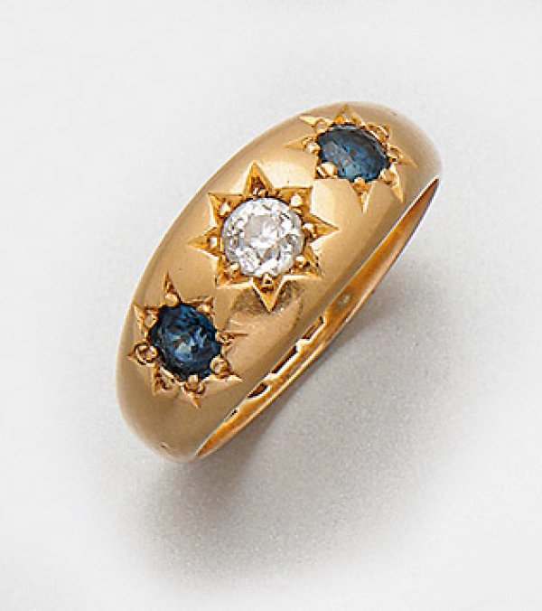 Klassischer englischer Saphir-Diamantbandring Chester, 1978. Gelbgold, gest. 18 ct.; Zentral besetzt mit einem Altschliffdiamanten von ca. 0,15 ct., flankiert von zwei nahezu kornblumenblauen Saphiren von zus. ca. 0,20 ct.; Gew. ca. 4,53 g.
