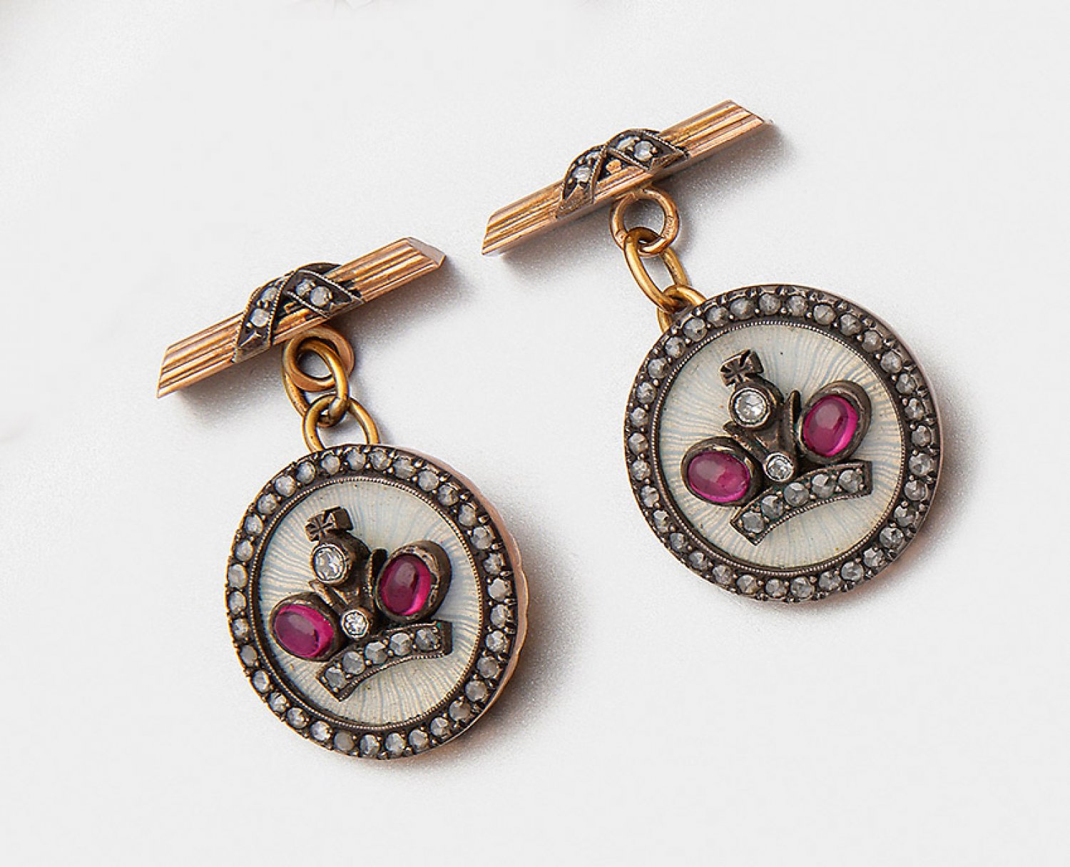 Paar russische Manschettenknöpfe Tricolor-Gold gest. 56 ct. (583) teilw. weiß emailliert. Medaillionförmiger Knopf schauseitig applizierte stilisierte Zarenkrone besetzt mit Rubincabochons und Diamantrosen rückseitiger Stecker mit Kreuzband-Dekor und korrespondierenden Diamanten. Etui. Gew. zus. ca. 19 57 g.