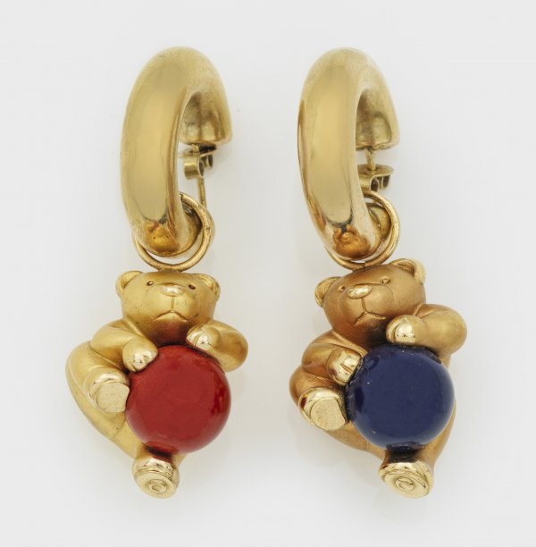 Paar Creolen mit großen Teddy-Anhängern Gelbgold gest. 750. Klassische Creolen jeweils besetzt mit einem plastisch gefertigten Bären. Ges.-Gew. ca.14 43 g.