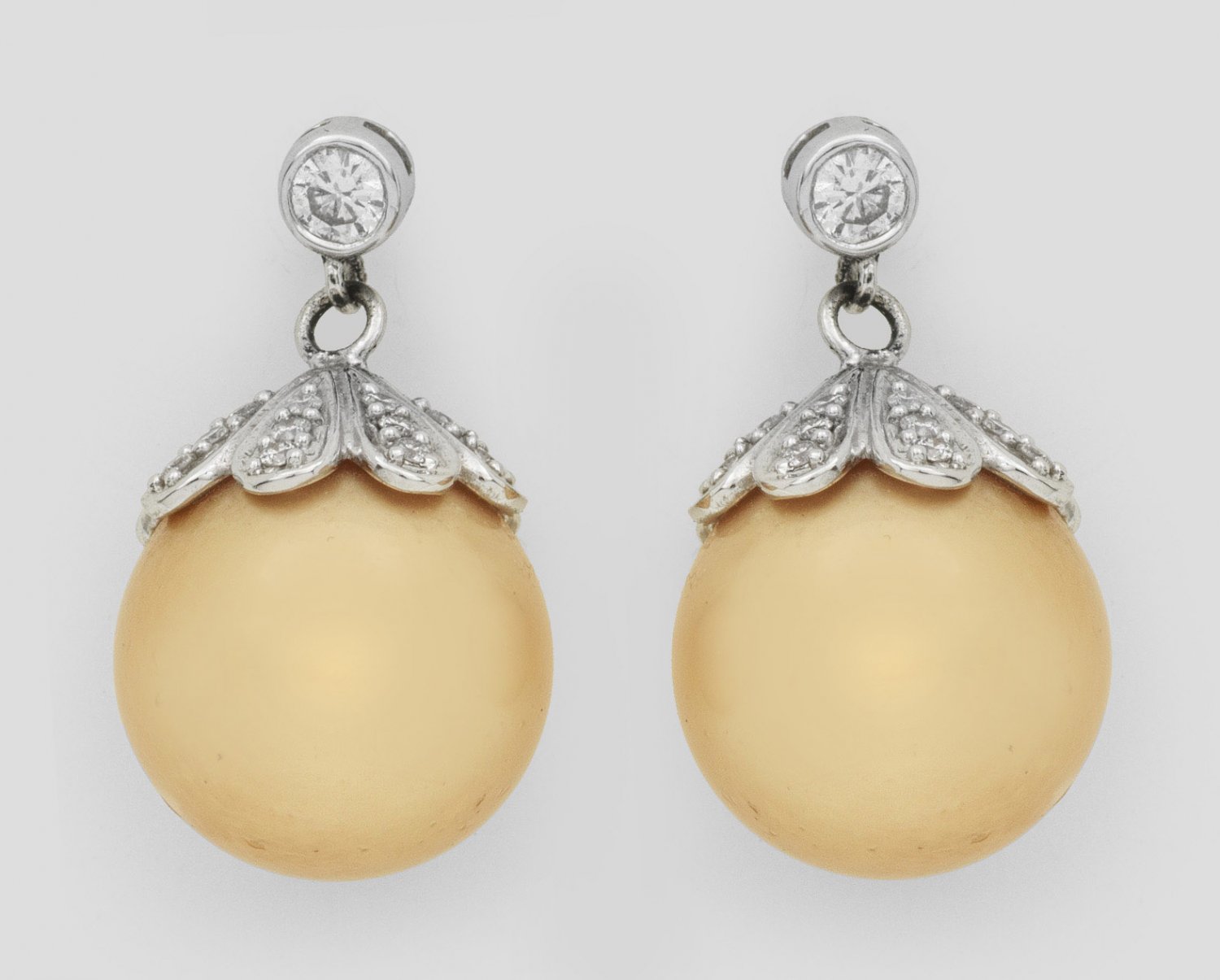A pair of rearrings set with golden south sea pearls approx. 14 mm and two diamonds approx. 0 20 ct. in 14 k white gold.