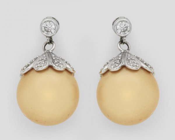 Paar elegante Südsee-Perlohrringe Weißgold 585. Steckbrisur besetzt mit jeweils einem Brillanten von zus. ca. 0 20 ct. unterhalb jeweils eine makellose goldene Südsee-Zuchtperle von ca. 14 mm in sehr farbintensivem rosé-grün changierendem Lüster. Ges.-Gew. ca. 10 98 g.