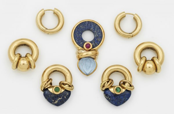 Dekoratives Lapislazuli-Parure Gelbgold gest. 750. Anhänger und korrespondierende Creolen mit zwei paar Anhängern besetzt mit Topas Rubin- und Smaragdcabochons und royalblauem Lapislazuli. Ges.-Gew. ca. 38 08 g.