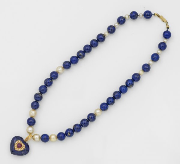 Dekoratives Lapislazuli-Perlcollier Gelbgold gest. 585. Einreihige Kette aus royalblauen Lapislazuli-Kugeln und weißen Zuchtperlen unterschiedlicher Größe abschließender korrespondierender Herzanhänger. Gew. ca. 64 69 g.