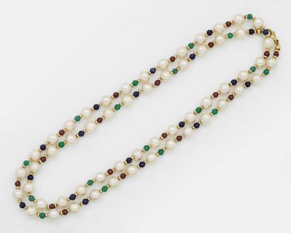 Klassische Perlsautoir Gelbgold gest. 333. Einreihige Kette aus weißen Zuchtperlen von ca.7 6 mm in sehr farbintensivem rosé-grün changierendem Lüster unterteilt durch Saphir- Rubin- und Smaragd-Perlen.